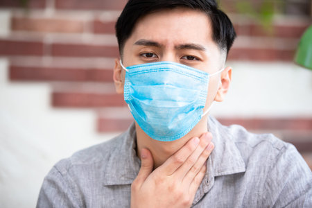 Closeup Young Man in hygienic mask suffering sore throat, 2019-nCoV or coronavirus. Airborne respiratory illness such as pm 2.5 fighting and flu isolated on white background. Banner size.