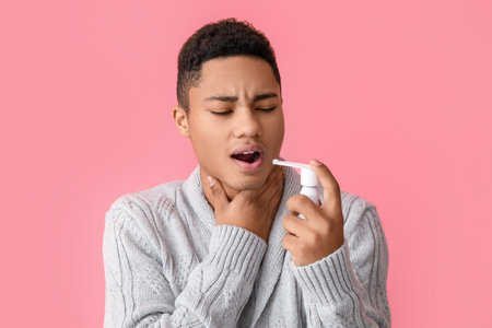 young woman irrigates her throat with medicated spray