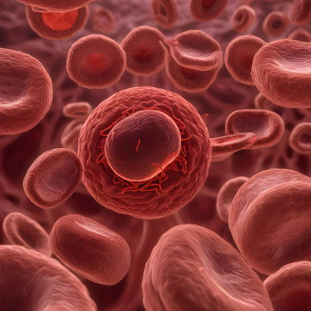 A captivating close-up view of red blood cells and immune cells interacting within a microscopic environment, showcasing biological processes in action.