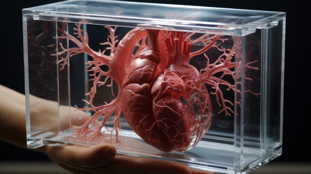 3d printed model of a human heart encased in transparent plastic, showing arteries and vessels