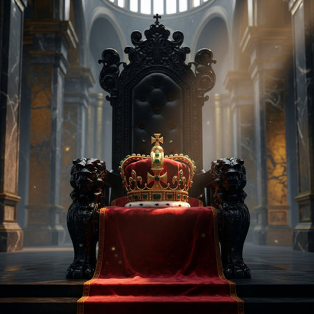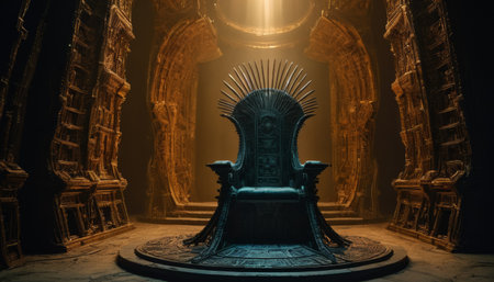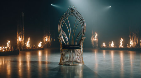 An elaborately designed throne sits in a dimly lit space, illuminated by spotlights and ambient fire effects. The image features a metallic chair against a dark backdrop. The composition is centered, emphasizing the regal aesthetic and creating a sense of drama suitable for various editorial and commercial applications.