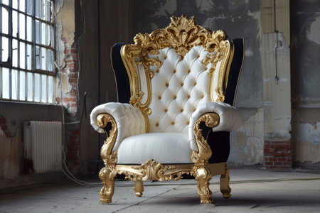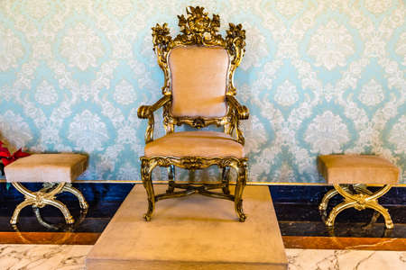 Retro golden interior of palace or museum. Classic elegant baroque armchair. Royalty seat Throne in luxury royal room. Historic vintage king white gold chair.