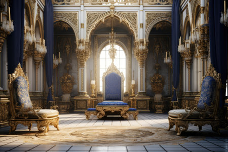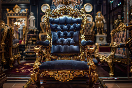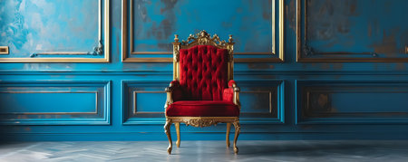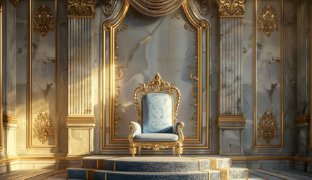A room featuring a blue chair and another identical blue chair, An ornate royal palace interior with gold details and lush fabrics, AI Generated