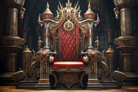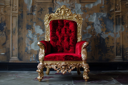 A striking ornate throne featuring plush upholstery and rich gold detailing, set in a dimly lit room that enhances its regal presence.