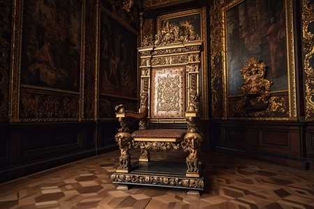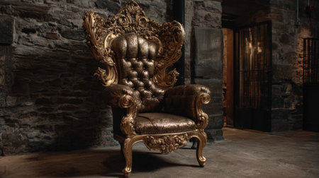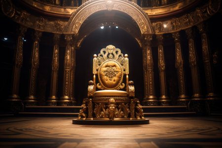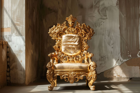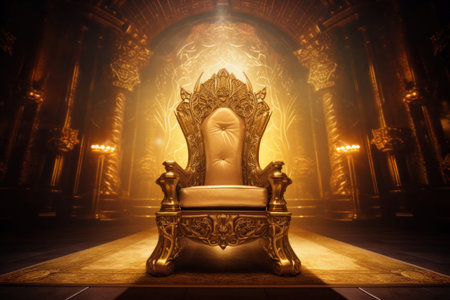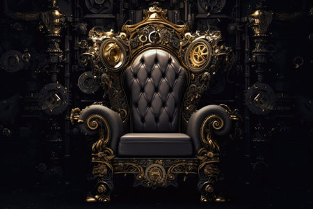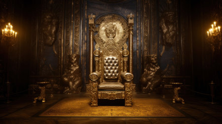 This AIgenerated artwork features a majestic throne, crafted in gold, perfect for a king, set against an elegant dark setting.