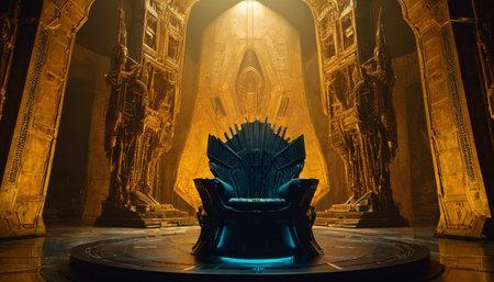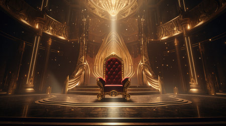 A striking throne sits in a grand, dimly lit hallway, surrounded by warm golden light. The scene captures a sense of power, mystery, and opulence, ideal for artistic and imaginative themes.