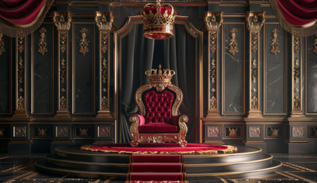 Throne Room with Gold royal chair, Classic interior with red armchair and golden curtains. 3d render, Ai generated