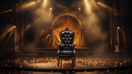 Black vintage leather armchair on the stage illuminated by spotlights.