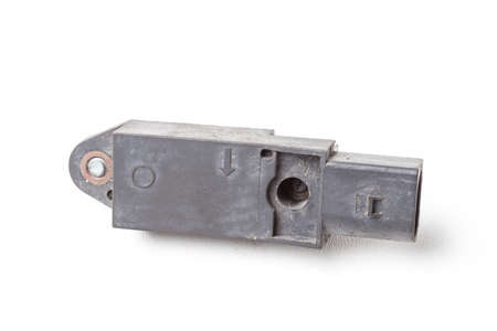 The removed spare part from the car on a white isolated background is an impact sensor when airbags are deployed in a black plastic case for replacement and repair. Spare parts catalog.