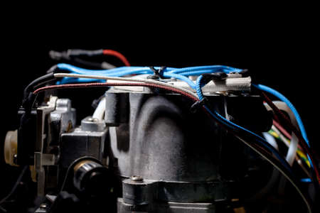 Close up of throttle body of engine drive system in a car with horizontal copy space on black background