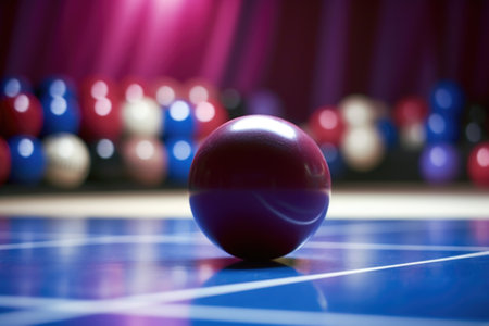 Striking view of a shiny red bowling ball reflecting lights and pins in the distance