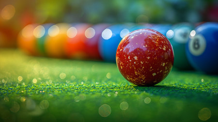 Balls for billiards on the green grass with bokeh background