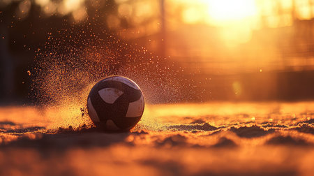 A close-up of a volleyball bouncing on a soft beach sand surface.