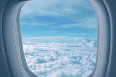 A captivating perspective of soft white clouds floating in the vast expansion of the sky as seen from an airplane window, evoking a sense of tranquility, wanderlust, and admiration for nature's