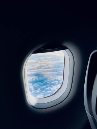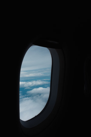 Detail of an airplane window with beautiful clouds outside, chiaroscuro