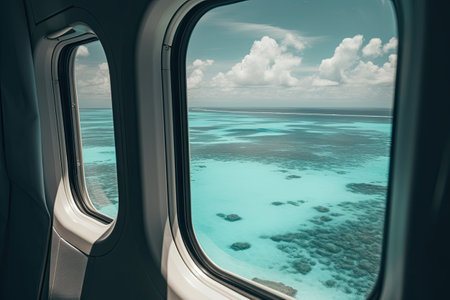 View of the beach and sea from the airplane window. Nature view through the aircraft window. Travel and tourism concept. Generative AI illustration