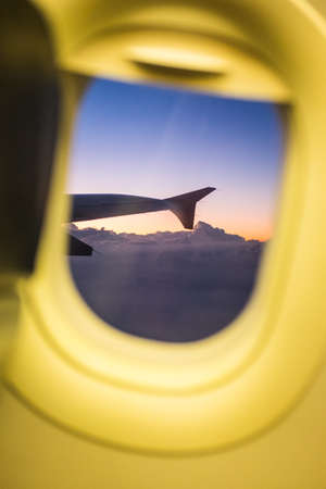 Typical airplane window view with pastel sky sunset and dark background wallpaper, dreaming atmosphere concept