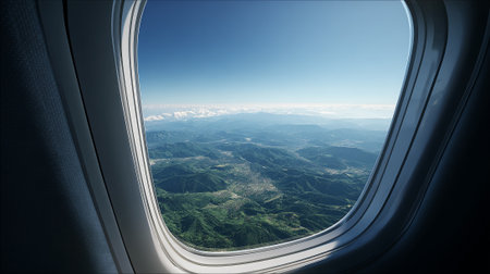 Aerial view of a landscape with mountains and forests seen from an airplane window
