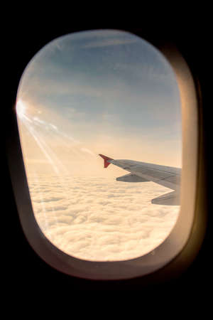 Beautiful scenic view through the aircraft window at sunset or sunrise time. vacation and travel.