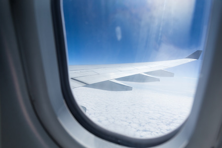 View from the porthole window flying airplane on the airplane wing. Flying and traveling concept