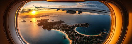Aerial View of Tropical Island Paradise With Turquoise Water From Airplane Window, Sunset Colors