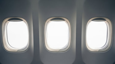 This image features three airplane windows against a white background. The windows are arranged in a row, providing a view of the sky outside. The image is on a transparent background, making it suitable for various design applications. Keywords: airplane, window, sky, white, background.