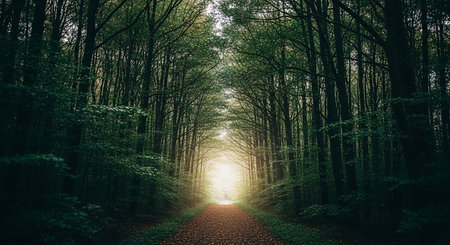 A breathtaking view of a forest pathway lined with towering trees, allowing sunlight to filter through the lush green canopy and create a serene atmosphere.