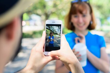 hands picking up a smartphone taking a picture of a young man doing exercise in exterior. Space for text. Selective focus