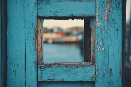 A weathered blue wooden door with a square opening that frames a blurred view of a harbor.