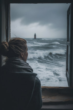 Woman Gazing at Stormy Sea and Lighthouse Through Open Window, Coastal Landscape in Moody Weather.