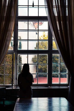 outside view of a Latina woman during isolation looking out the window. outside view of a Latina woman during isolation looking out the window. Photo with reflections in the glass