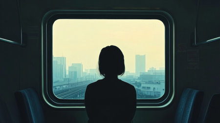 A woman looks pensively through a foggy window, lost in thought during a rainy day in a bustling city. Soft light filters through, enhancing the mood of introspection.