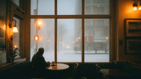 the somber mood of a person sitting alone at a cafe, the window reflecting the blue hues of the early morning sky. Blue Monday