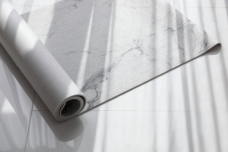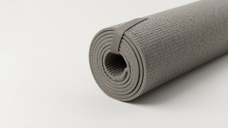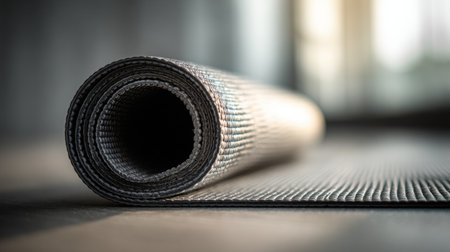 A rolled yoga mat placed on a smooth surface, creating a serene environment perfect for practice.