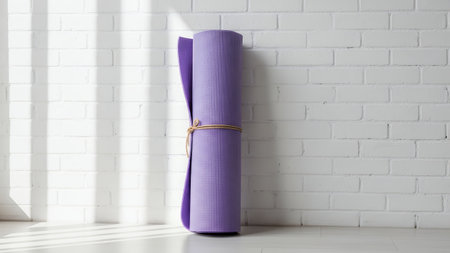 Rolled up purple yoga mat stands upright against a clean white brick wall, illuminated by natural sunlight creating striking shadows on the floor and wall