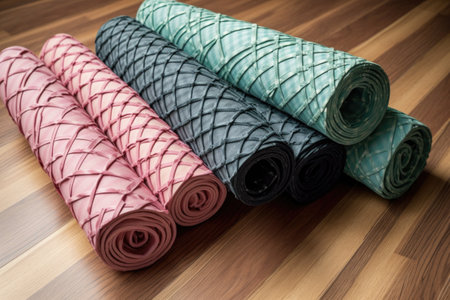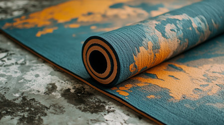 A close-up shot of a rolled yoga mat showcases vibrant colors and highlights the essence of fitness, relaxation, and meditation for wellness-focused individuals.