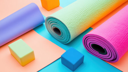 This image features colorful exercise mats and foam blocks arranged on a vibrant background, ideal for showcasing fitness and wellness activities.