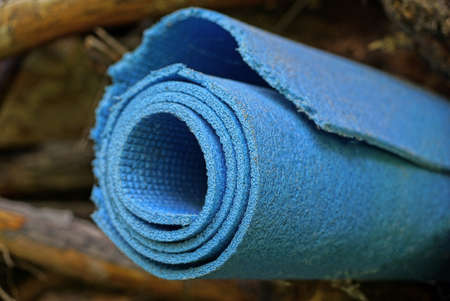 one blue plastic tourist mat rolled into a roll lies on the street