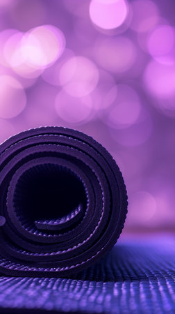 Rolled purple yoga mat on textured surface with bokeh background, fitness and wellness concept