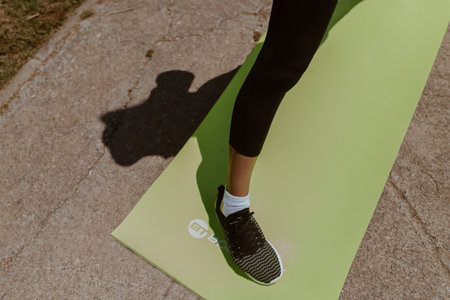 Closeup of woman after fit training, folding her yoga mat outside. Fitness, sport and healthy lifestyle.