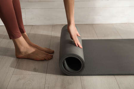 Woman rolling black yoga mat on floor indoors, closeup