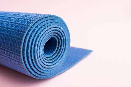 Sports background with pink rolled sports Mat, yoga on blue background with space for text.