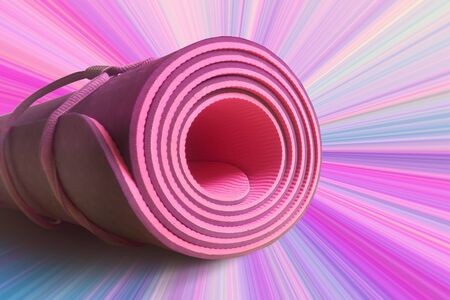 Pink half rolled yoga mat on magenta background. Yoga and pilates. Fitness and health. Exercise equipment.