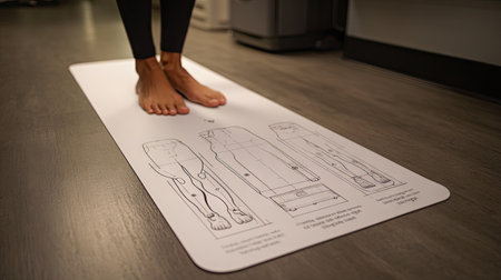 Close-up of a feet on an anatomy mat featuring clear diagrams for understanding body mechanics, promoting wellness and enhancing therapy practices.