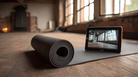 A rolled yoga mat sits on the wooden floor of a well-lit studio with a tablet displaying a workout video. The space is calming and perfect for exercise.