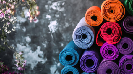 A stack of colorful yoga mats rolled up and leaning against a wall in a peaceful studio.
