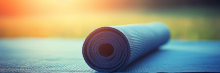 Rolled blue yoga mat on background. Fitness and exercise concept. active lifestyle. Workout at home or gym banner. Generative AI
