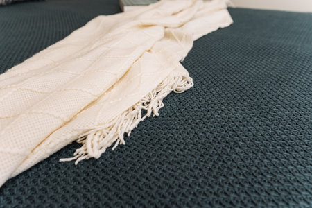 Textured Throw With Fringe Details, Warm Neutral Fabrics Enhancing Bedroom Aesthetics, Intimate Flatlay Of Soft Natural Fibers And Intricate Textile Craftsmanship In Cozy Setting