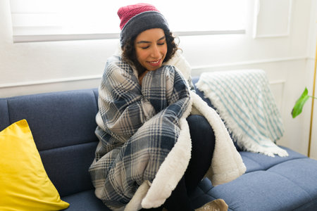 Relaxed beautiful young woman with a knit hat smiling and enjoying the winter weather wrapped in a blanket relaxing on the couch and smiling at home