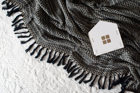 Wrinkled plaid blanket with geometric pattern on a white table. Empty space for copy. Brown folded corner for lifestyle purposes. Soft woolen material for cold weather. Warm and cozy textile feeling.